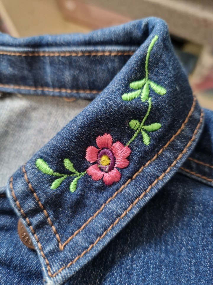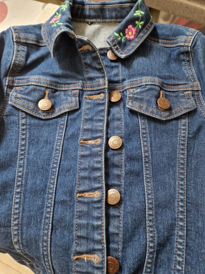 Pre-loved and re-imagined stretch fitted denim jacket for girls age 8–9. The back panel is beautifully embroidered with a unicorn resting in a meadow of wildflowers, while the collar is decorated with matching floral details. A magical and unique jacket perfect for little dreamers.